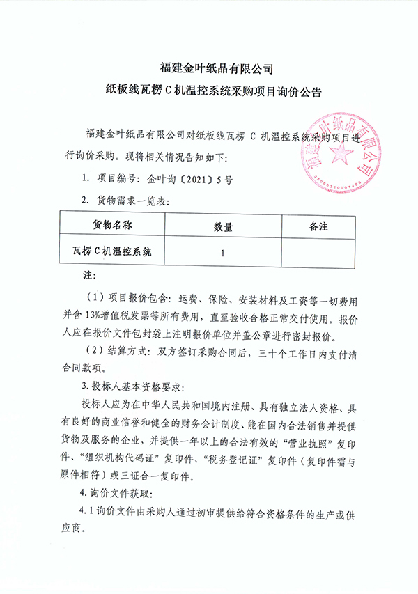 福建金葉紙品有限公司紙板線瓦楞C機(jī)溫控系統(tǒng)采購項(xiàng)目詢價(jià)公告