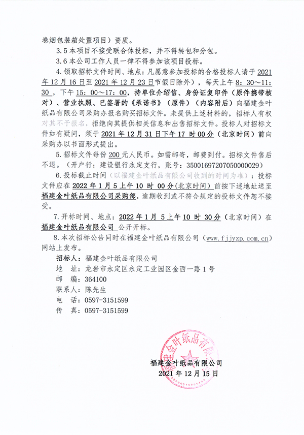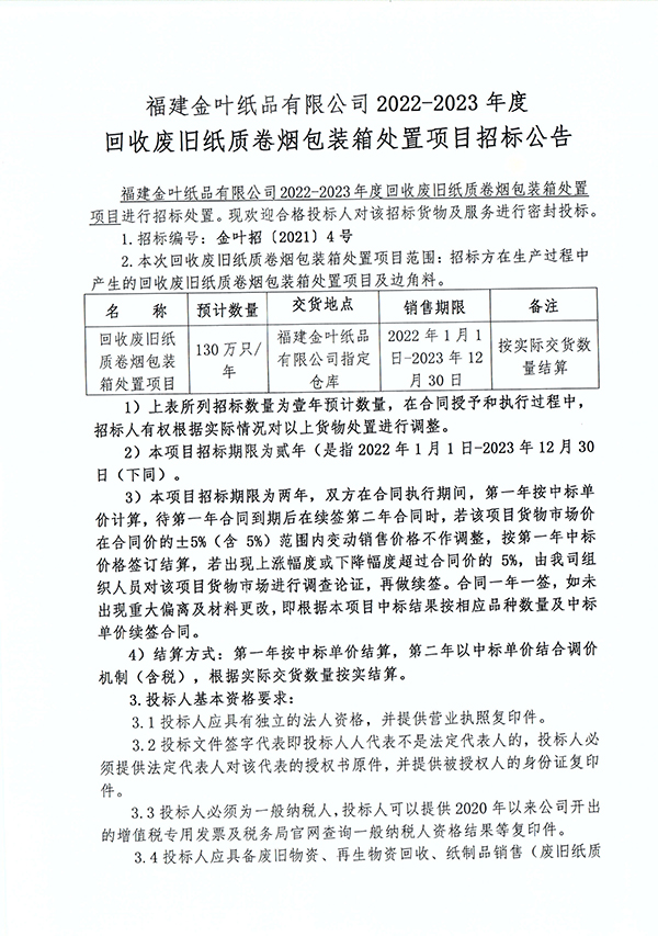 福建金葉紙品有限公司2022-2023年度回收廢舊紙質(zhì)卷煙包裝箱處置項(xiàng)目招標(biāo)公告