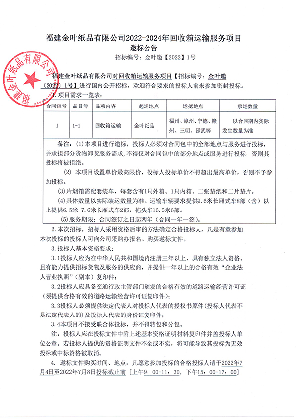 2022-2024年度回收箱運輸服務項目邀標公告