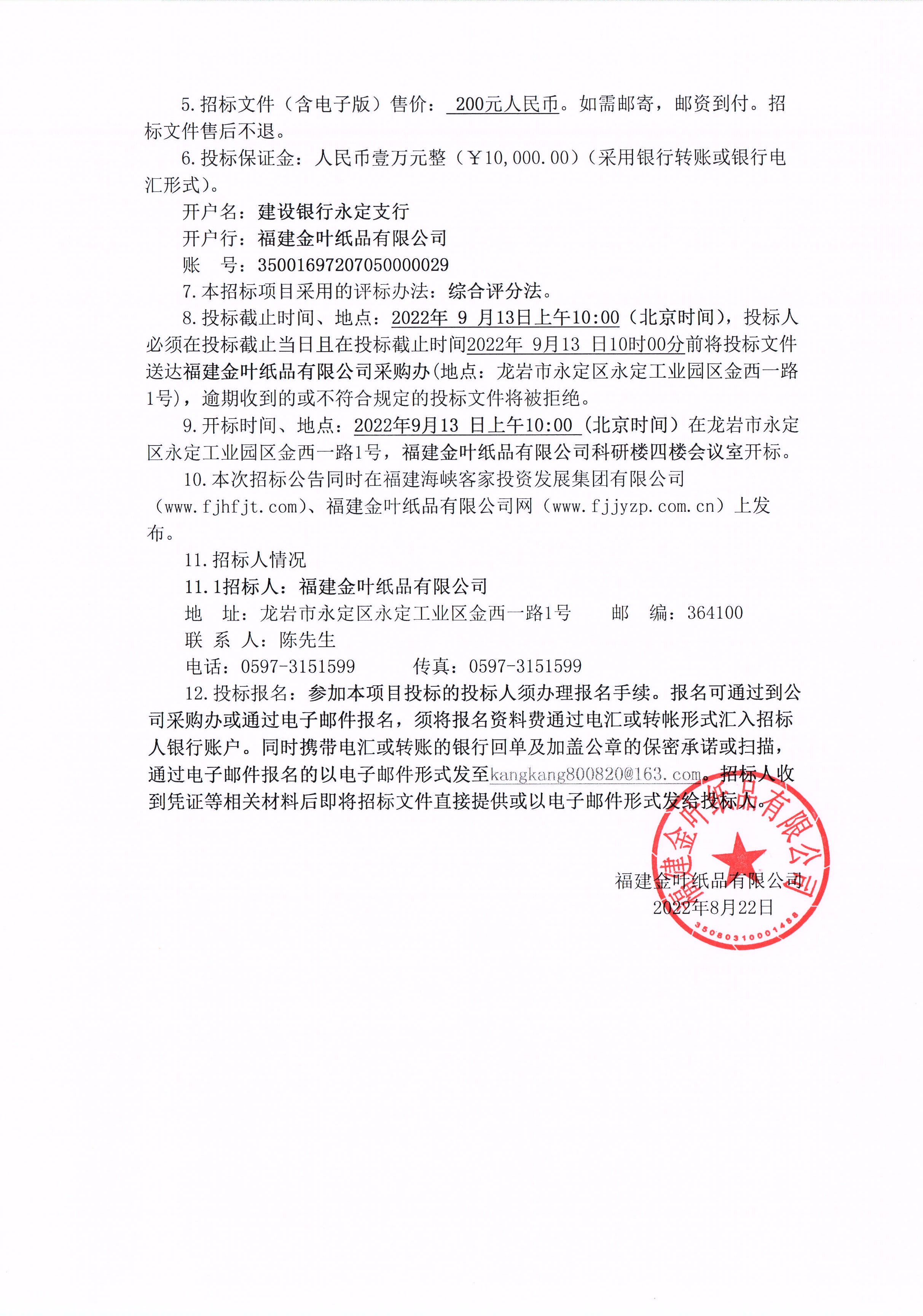 福建金葉紙品有限公司2022-2024年紙箱紙板運輸服務項目招標公告
