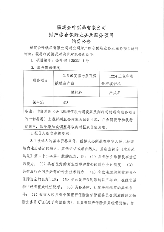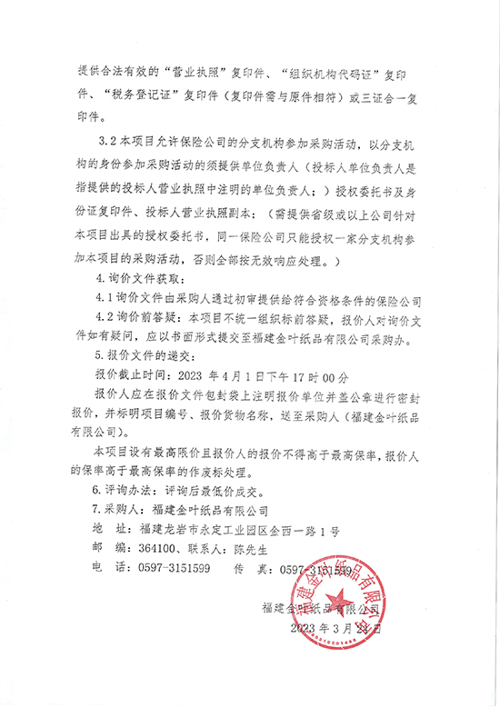福建金葉紙品有限公司財產綜合保險業務及服務項目詢價公告