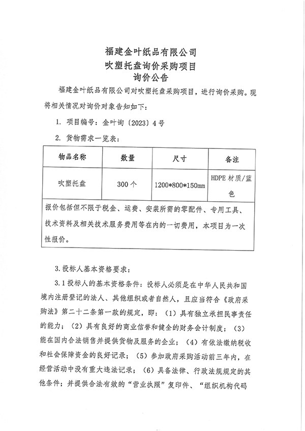 福建金葉紙品有限公司吹塑托盤(pán)采購(gòu)項(xiàng)目詢(xún)價(jià)公告